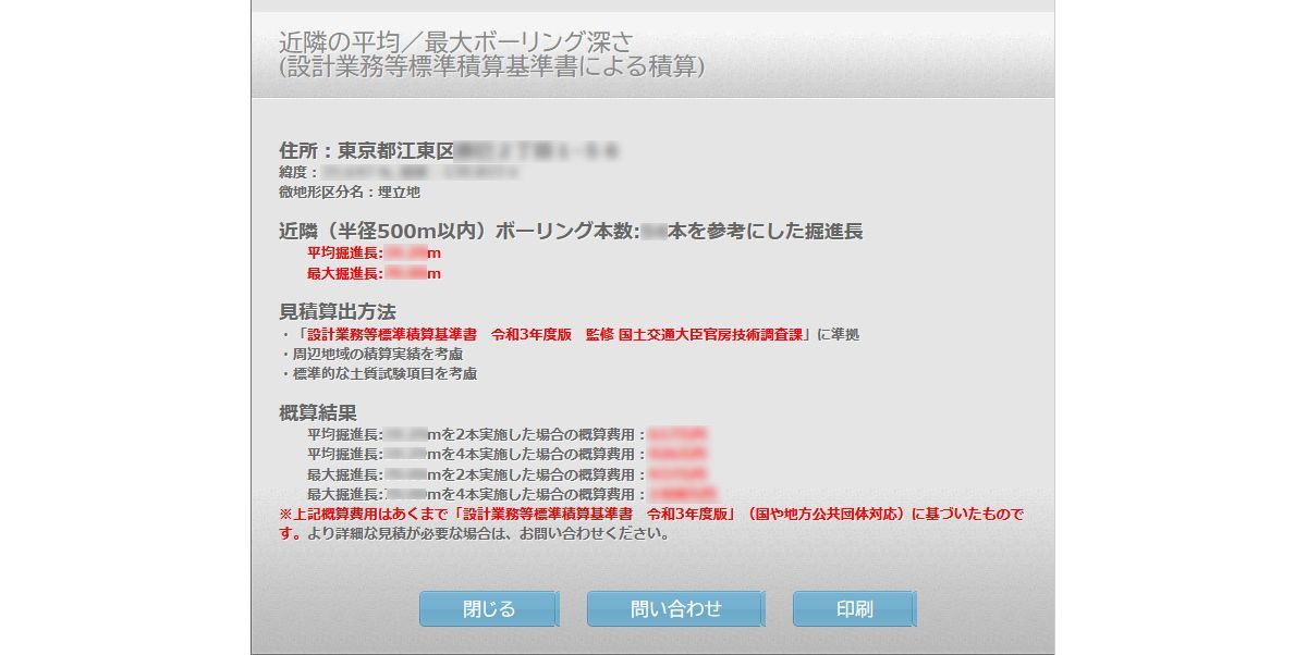 (東京都含む1都3県限定)登録されたボーリングデータ情報から、ボーリング調査・簡易見積機能がお試しいただけます(あくまで機械的に算出されるもので算出された金額は参考情報としてお取り扱いください)。