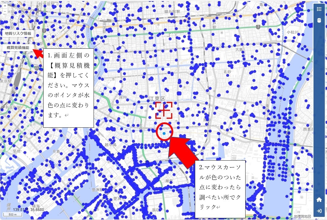 2.画面左側の「概算見積機能」ボタンを押すとマウスカーソルが「●」になりますので、 調べたい箇所をクリックしてください。