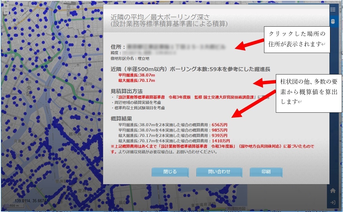 3.しばらくすると概算費用、また周辺(半径500m以内)のボーリング掘進長などが表示されます。